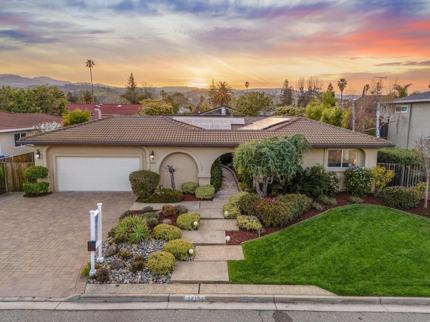 Wonderful single story in beautiful Saratoga w/ Cupertino schools! Special property meticulously cared for by owners for decades. Quiet neighborhood yet easy commute near several major Fortune 500 companies. Welcoming stone footpath to charming archway entry bordered by mature landscaping & manicured gardens. Double doors to spacious foyer overlooking formal dining & great room w/ vaulted ceiling & picture windows-views of rear yard. Hwd floors, built-in cabinets & stone on fireplace in family room. Just beyond, kitchen enjoys 2 ovens/warming drawer, solid surface counters & dining nook. 4 spacious bedrooms include double doors to office/bedroom w/ built-in desk. Primary suite has cherry built-in cabinetry/wardrobe & access to rear yard. Primary bath-double vanity & large stall shower. Guest bedrooms w/ hwd floors & lg closets share hall bath w/ dual vanity & shower-tub combo. Spacious redwood deck & sparkling pool is perfect for entertaining. Large motorized awning provides comfort on hot days. Mature hedges & sculptural trees surround perimeter creating a delightful, relaxing space. Inside laundry, oversized 2 car garage w/ work room. Leased Solar Panels for energy savings! Special neighborhood -hidden gem, convenient to shopping, top Cupertino schools & major freeways.