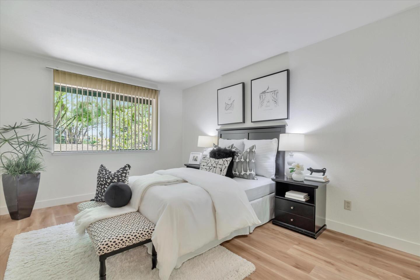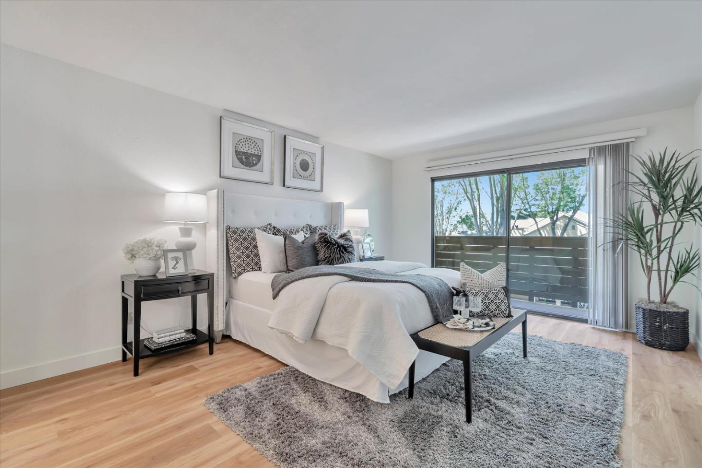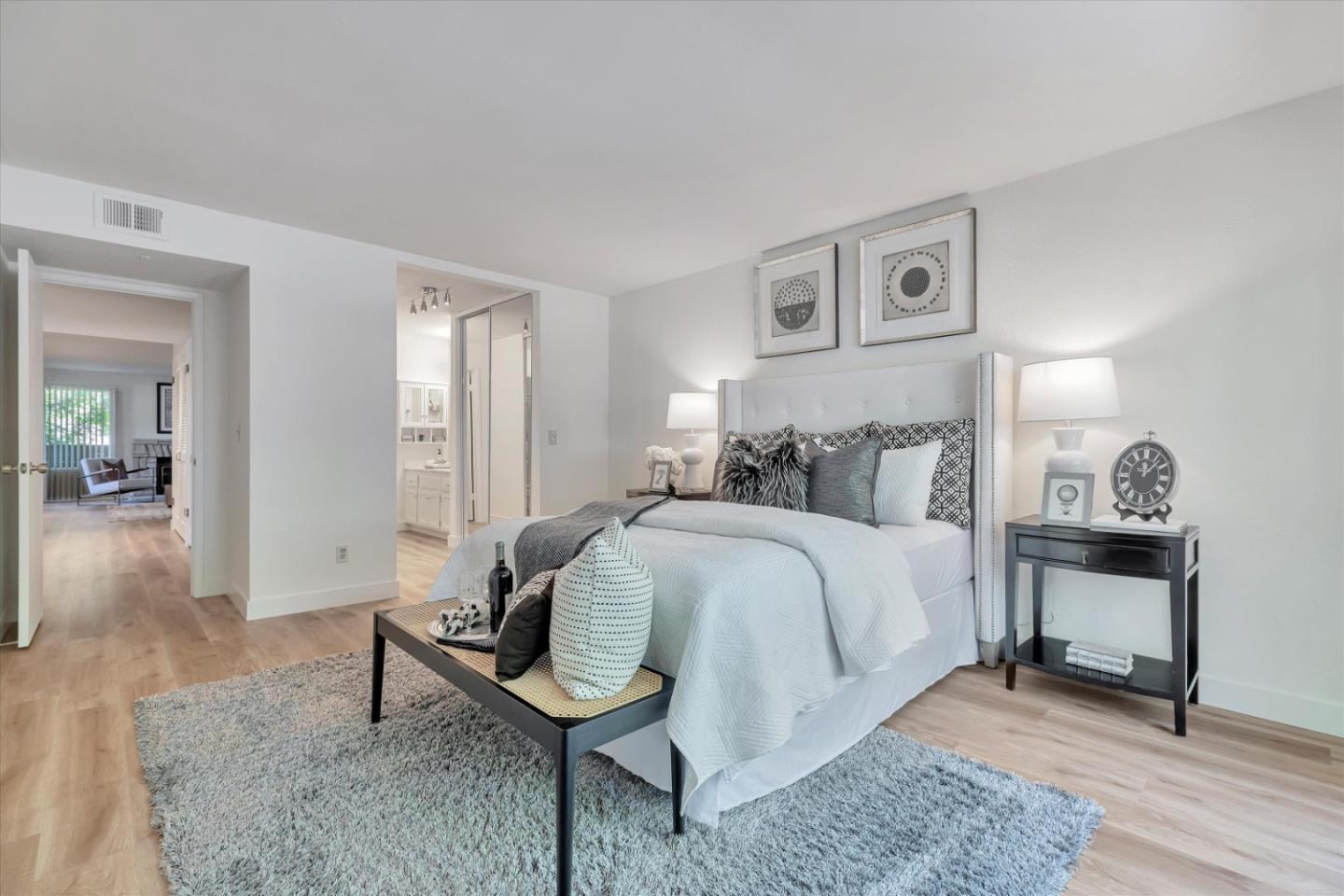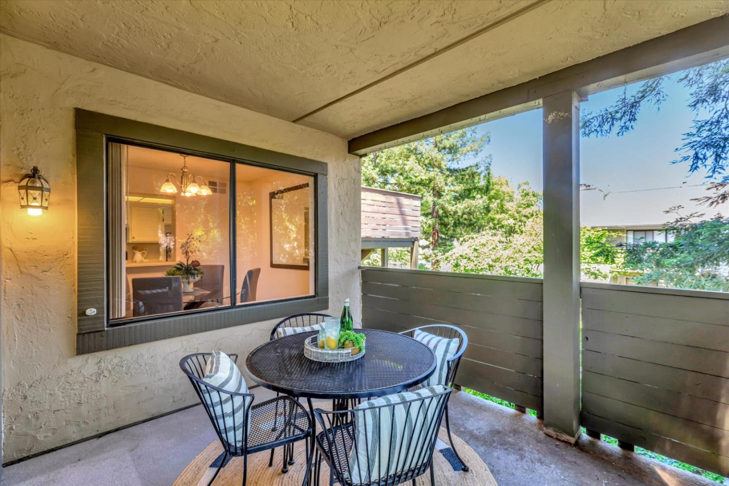 Discover the charm of this inviting second-story condo in a desirable Santa Teresa community! The two-bedroom, two-full-bathroom condo welcomes with freshly installed luxury stone polymer core flooring throughout. Step into the well-designed floor plan, featuring a generous great room complete with a brick surround fireplace, perfect for cozy evenings. Adjacent, you'll find a dining area ideal for enjoying meals with loved ones, with easy access to a spacious private balcony delightful spot for morning coffee or evening relaxation. The primary bedroom offers practicality and comfort with two closets equipped with organizers and its own private balcony, providing a serene retreat. Meanwhile, the second bedroom features a convenient closet and easy access to the hall bathroom, ensuring privacy and functionality for all occupants. Outside, enjoy the community's fantastic amenities, including a clubhouse, refreshing pool, soothing spa, and convenient BBQ grills. Embrace the serene atmosphere of the surrounding greenbelt, where mature trees create a welcoming environment for outdoor strolls and relaxation. Experience the warmth and convenience of Santa Teresa living in this charming condo, where comfort meets practicality in a delightful community setting.