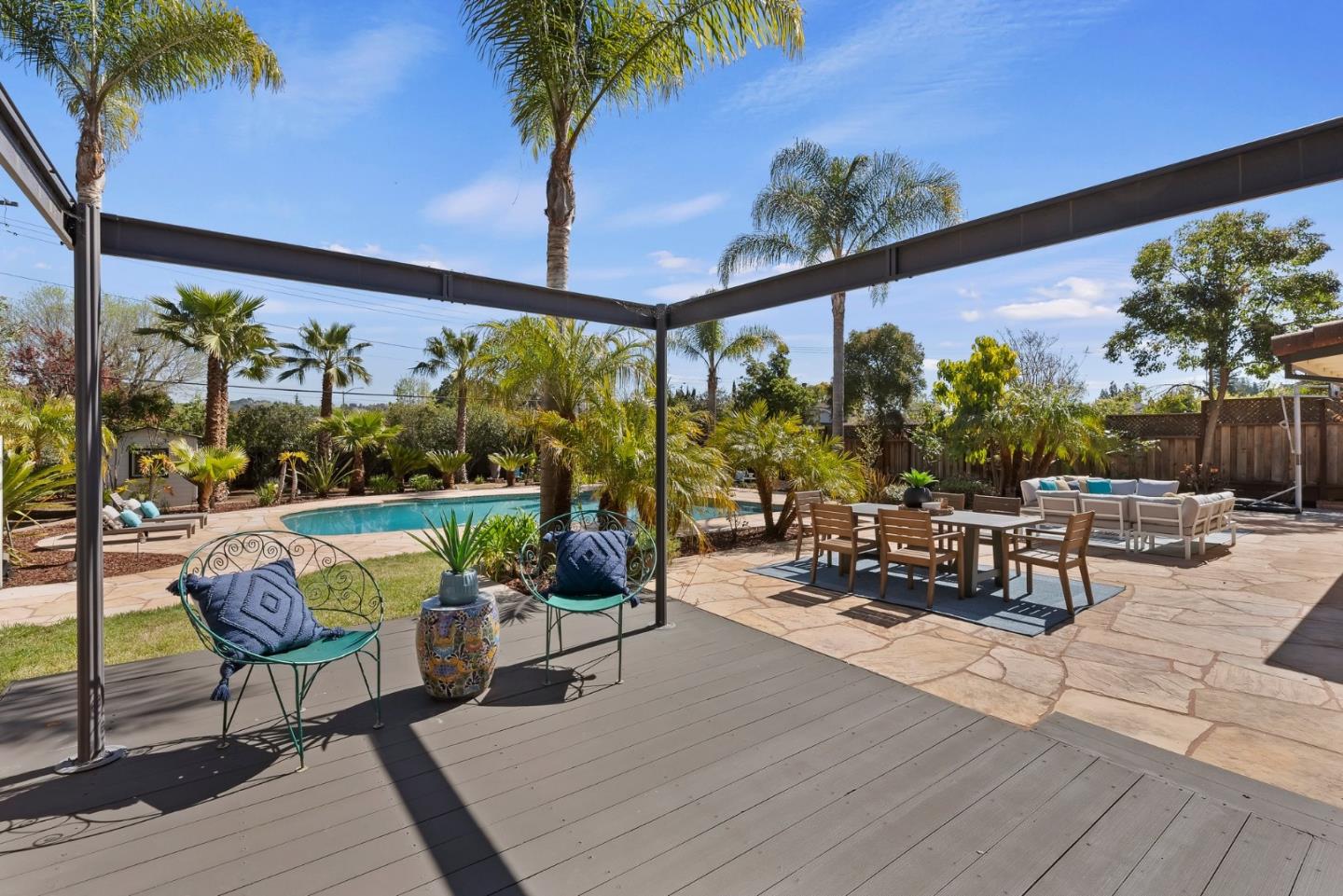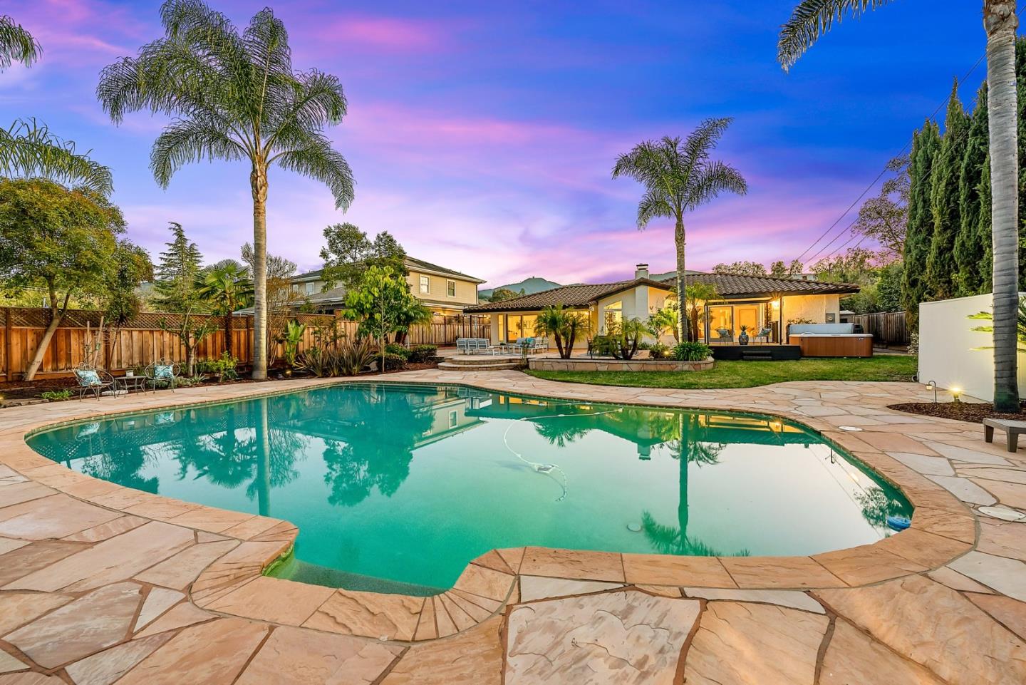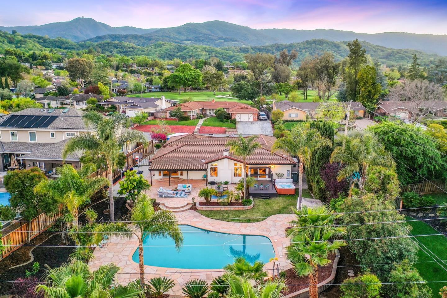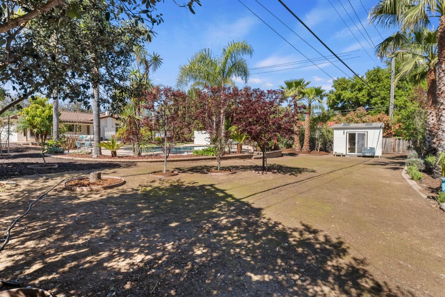 Almaden Valley Country Club neighborhood! Single-story-oversized double lot of half acre! Rare amenity-an oasis for outdoor living! Expansive flagstone paver patio, sparkling pool, spa, mature landscaping will captivate! Paver driveway leads to courtyard entry. Fresh paint inside & out, new garage door, exterior lighting. Picture windows thru out showcase beautiful views. Thoughtful floor plan w/ generous living spaces, 5 beds/2.5 bath. Living room w/ vaulted ceiling/oversized windows frame captivating views, formal dining. Kitchen w/ nook, large family room. Primary suite w/ access thru the sliding doors to rear wood deck/spa, walk-in closet & spa-like bath. Beautiful grounds-Sparkling pool beckons on warm days. Large patios for entertaining or relaxing. Versatile workshop or playhouse, greenhouse & array of fruit & palm trees. Ample storage in shed or oversized detached 2-car garage. Lg gated & paved side yard perfect for RV, boat or oversized vehicles. Steps from parks, hiking trails, Country club, Tennis club! Top Almaden Schools, Williams, Bret Harte Leland!